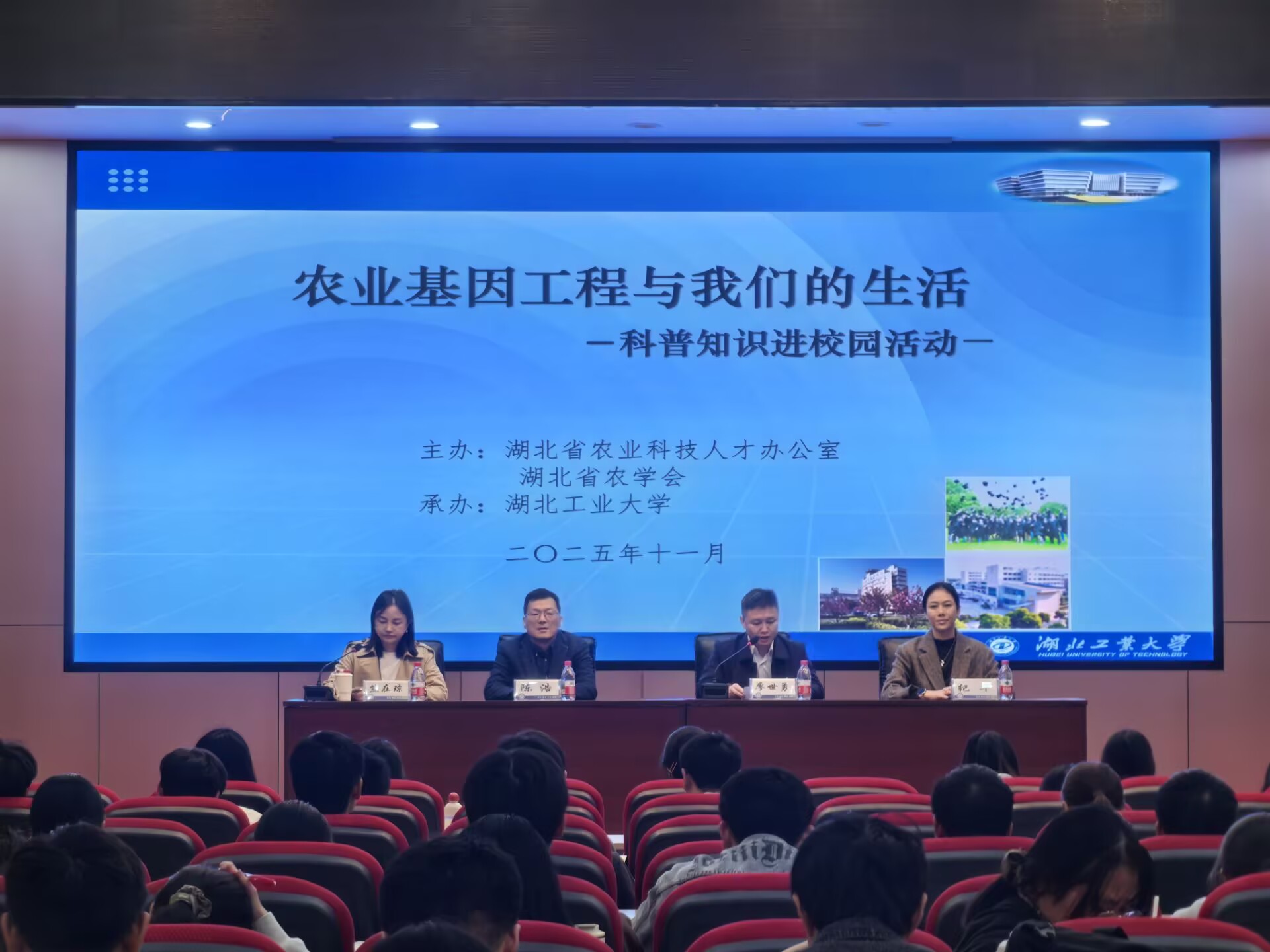11 月 12 日下午,由湖北省农业科技人才办公室、湖北省农学会主办,湖北工业大学承办的 “农业基因工程与我们的生活” 科普讲座在大学生活动中心博学堂顺利举办。湖北省农业科技人才办公室廖世勇主任、华中农业大学博士生导师陈浩教授、湖北工业大学农机鉴定站纪华站长及科发院熊在琼副院长出席活动,活动由湖北工业大学科发院熊在琼副院长主持。学校师生代表踊跃参与,共同探寻转基因技术的奥秘。