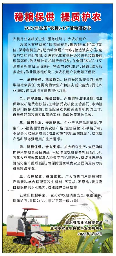 为深入贯彻落实“保供固安全、振兴畅循环”工作定位,保障春耕生产,助力粮食增产增收,营造诚实守信、创新务实的行业氛围,促进农机化转型升级和农机装备补短板强弱项,依法维护农机消费者权益,在全国“农机3·15”消费者权益日活动期间,特面向农机生产、经销、维修服务企业,作业服务组织及广大农机用户发出如下倡议: